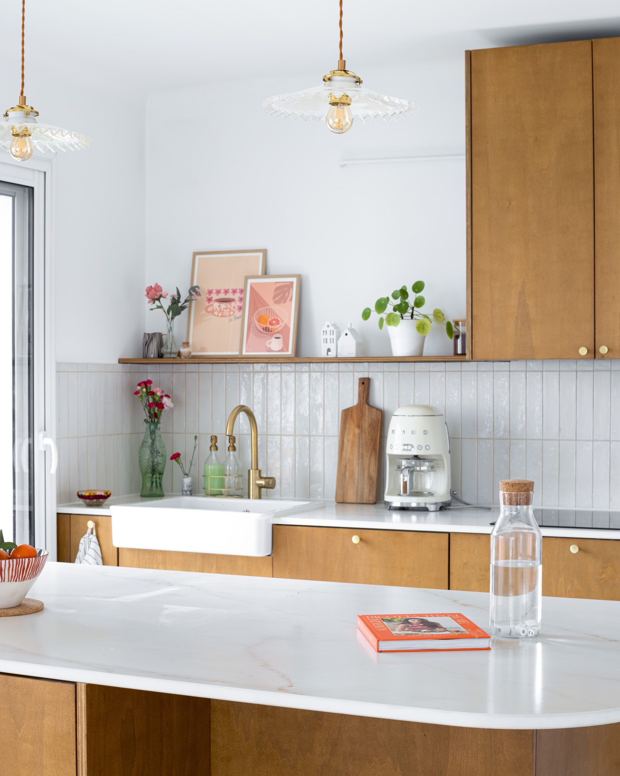 Un grand plan de travail connecte cuisine et salle à manger et crée un nouvel espace convivial où la cliente aime recevoir.